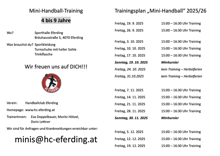 Das Mini-Training für Buben und Mädchen findet jeden Freitag von 15:00-16:30 Uhr in der Sporthalle Eferding statt.